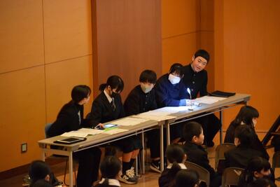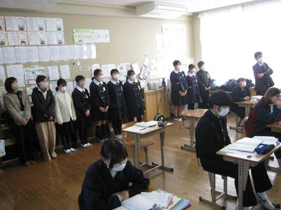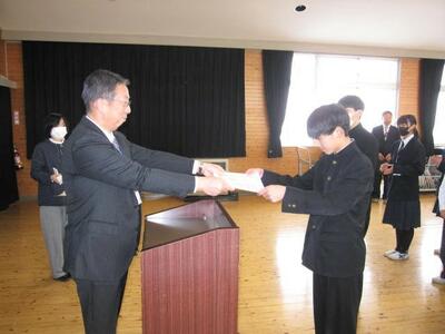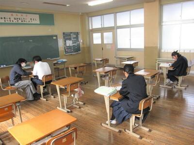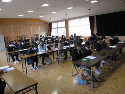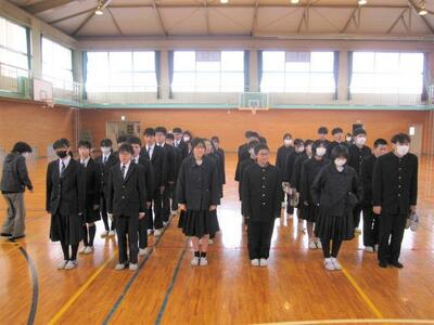 いよいよ明日は卒業式です。昨日、一昨日の公立高校一般入試を終え、3年生は晴れ晴れとした顔で登校して来ました。まず、学級で卒業式の練習をした後、全校で卒業式の予行を行いました。