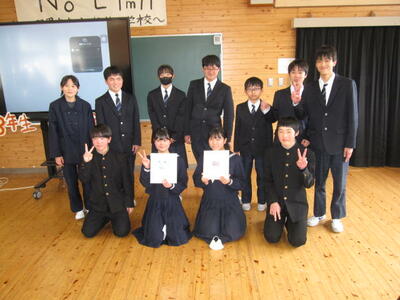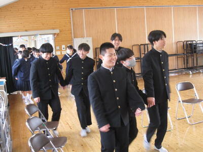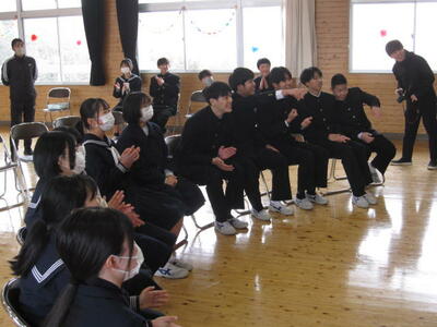 そして次は、お楽しみの『3年生を送る会』です。執行部が中心となって運営し、「1年生の出し物」「2年生の出し物」「生徒会の出し物」「各部でのお別れの儀式」などを行いました。出し物の内容は、「哲西中学校の校舎にまつわるクイズ」「この3年生は誰でしょうクイズ」「この先生は誰でしょうクイズ」「伝言ゲーム」などです。1・2年生の周到な準備・演出が、3年生の飛び切りの笑顔を引き出していました。全校生徒・教職員が楽しめ、3年生に感謝の気持ちが伝わる会となりました。さあ、明日は全校上げて、素晴らしい卒業式にしましょう。